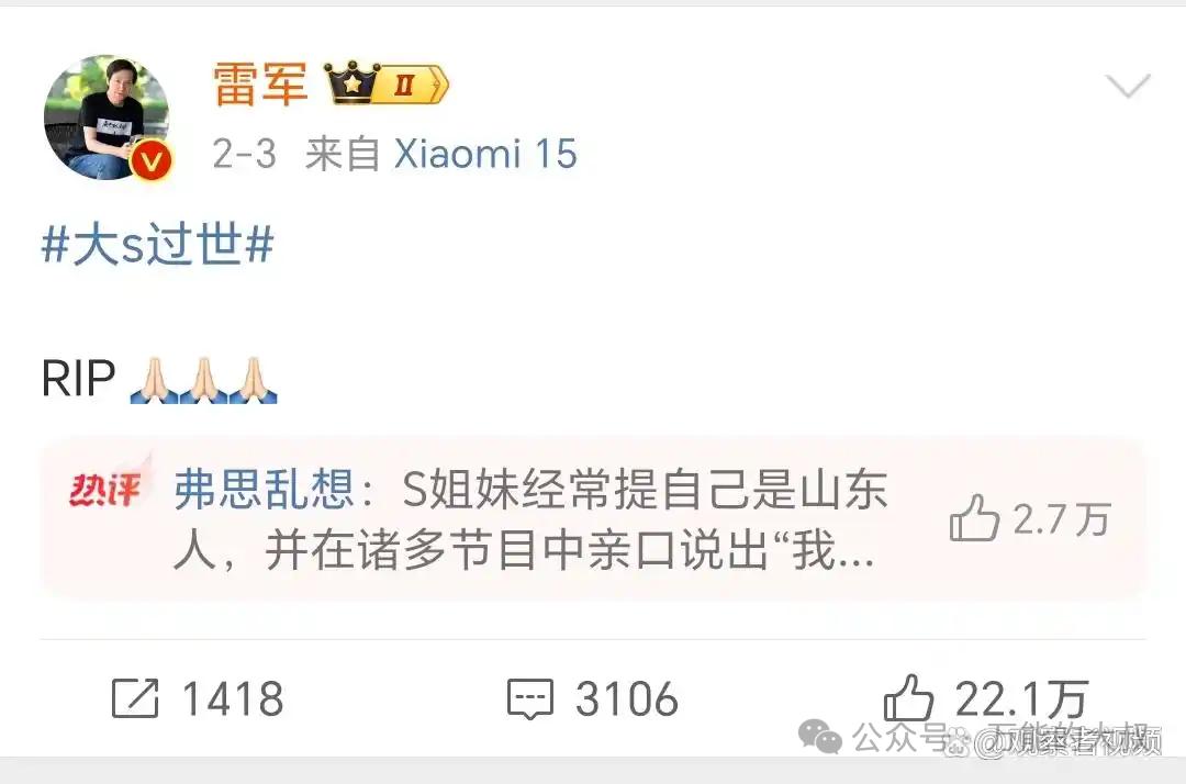 2、大S死了,雷军都在微博上哀悼,现在可是小米粉丝啊!