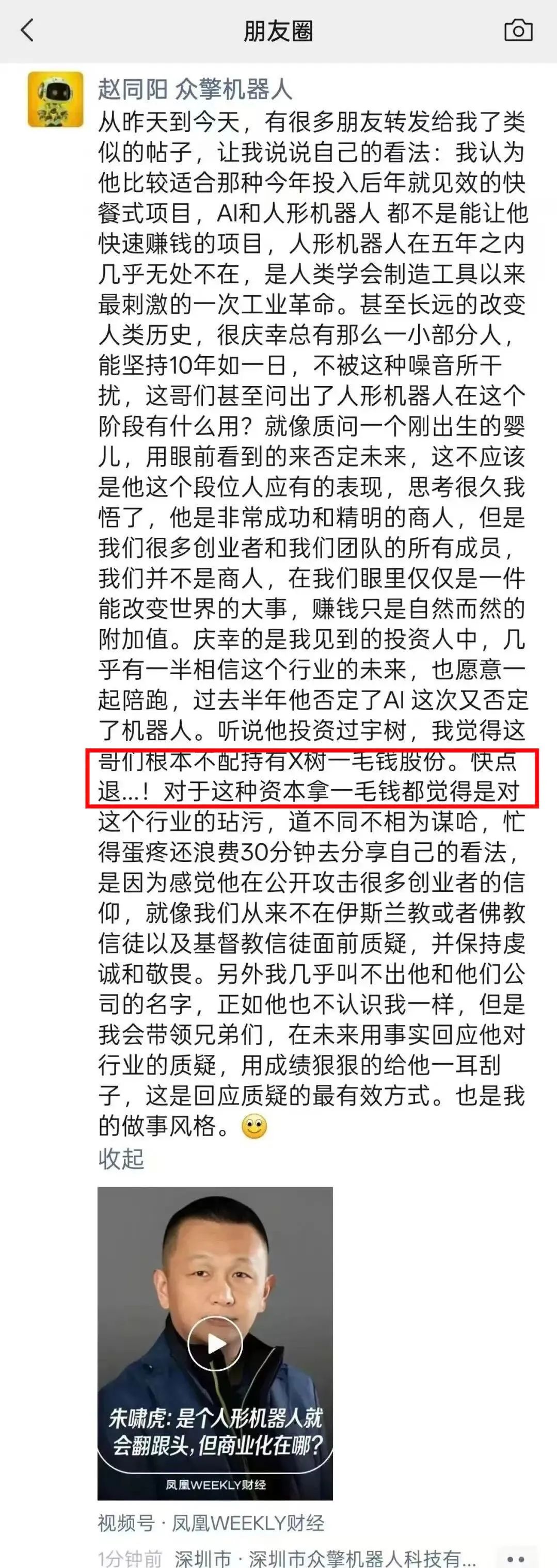 朱啸虎“批量撤离”人形机器人的言论一出来,就首先遭到创始人的反击。其中,中擎机器人首席执行官赵同阳的评论特别犀利,直言“这哥们不配拥有宇树一毛钱的股份。”
