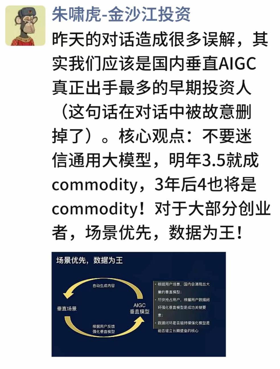 2023年3月,当整个行业都在讨论ChatGPT会给创业者带来什么新机遇时,朱啸虎提出:“ChatGPT对创业公司非常不友好,请在未来两三年内放弃融资想象”。这句话也引发了傅盛和他之间的多轮“唇枪舌战”。