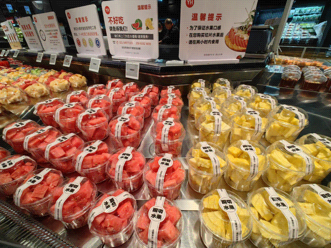 热带水果橱柜配有猫山王榴莲、智利樱桃等受欢迎的物品,吸引年轻家庭停留。很多水果的甜度和产地都有明显的标志,进一步激发了用户的消费信任。新鲜度方面,新鲜水果切割场景明确,客户可以看到员工加工材料,成品严格遵守“468”原则:4小时八折、6小时六折、8小时下架;草莓等柔软产品“当天清空”。