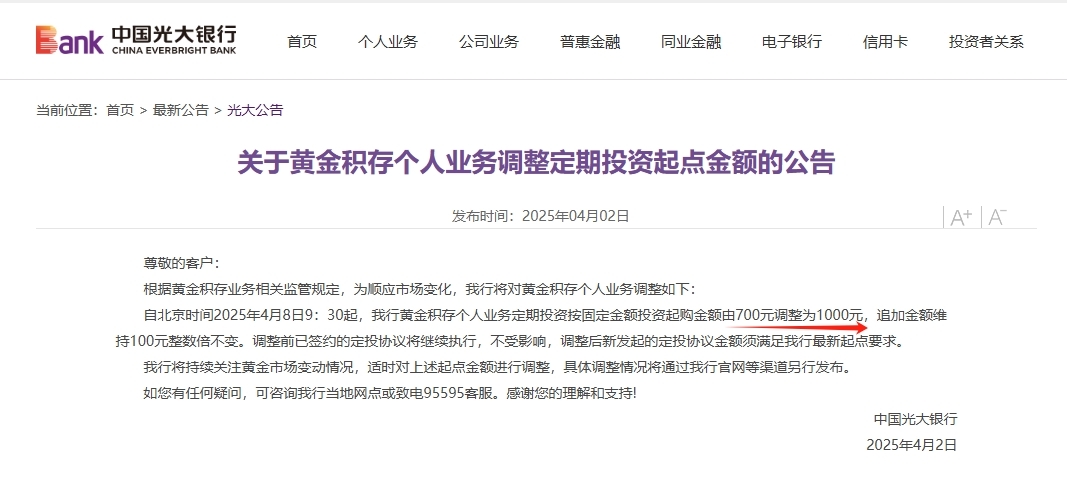 2024年9月30日,光大银行宣布,自2024年10月8日9日起,根据黄金囤积业务相关监管规定,为顺应市场变化,:30起,定期投资该行黄金囤积个人业务,按固定金额投资起购金额由600元调整至700元。