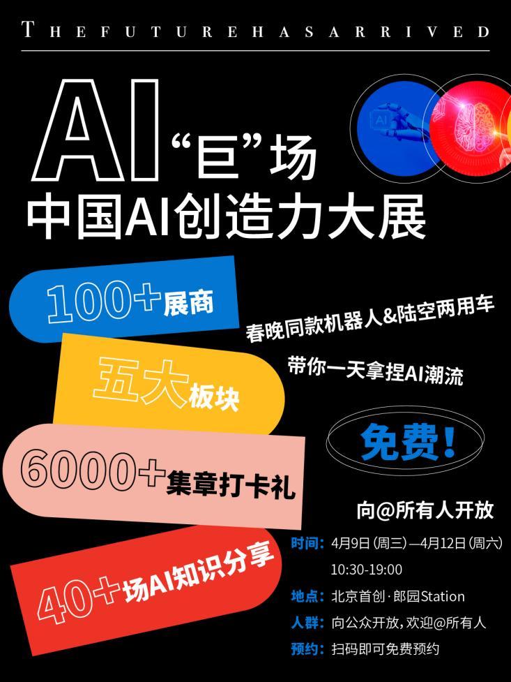 4月9日至12日,中国首个面向全国公众开放的AI主题展示——由朝阳区指导、阿里云主办的AI“巨大”领域中国AI创造力展示将在北京首创郎园Station正式举行。