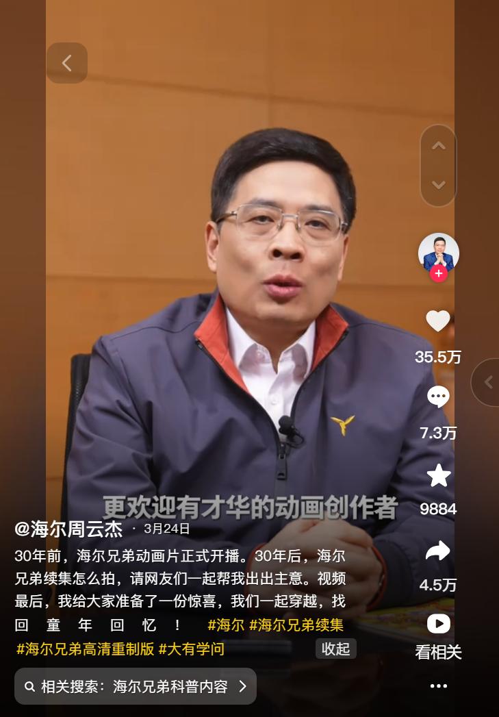 在采访中,周云杰说:“我不是网红”,但是恭喜这位总裁,成功地引起了网友的关注。目前,周云杰Tiktok的粉丝已经超过120万,开始“宠粉”。应网友要求,全平台推出海尔兄弟高清重制动画,宣布海尔兄弟续集已进入规划阶段,作品将与年轻用户共创。它可能以动画、短视频和互动游戏的形式呈现,并表现出邀请所有网友一起玩耍的认真态度。