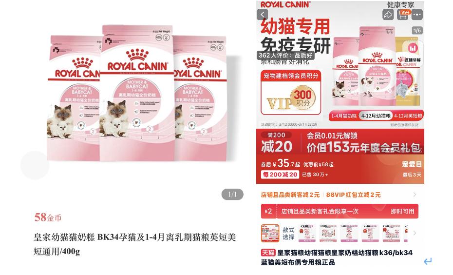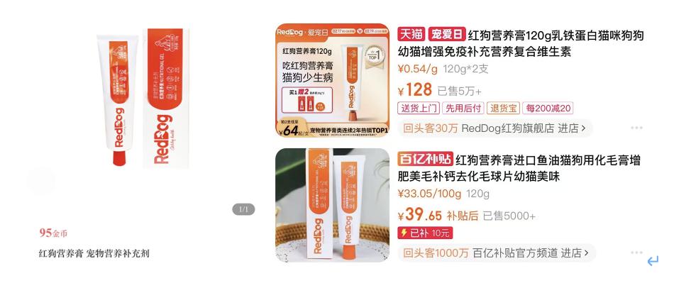 但是我们发现,即使是品牌猫粮,很多宠物收养馆也比市场上贵得多。 例如一只 120g 在宠物领养馆小程序上销售红狗营养膏 95 元,天猫旗舰店 128 人民币可以买两个,百亿补贴更便宜, 39.65 元一只; 400g 皇家小猫奶糕在领养馆小程序上销售 58 天猫领完券后,元, 35.7 可以买到元。