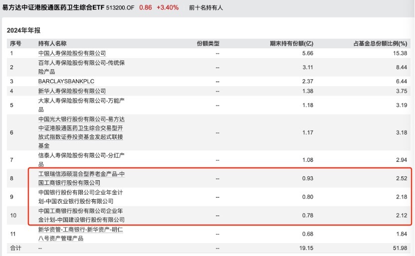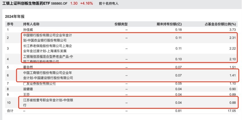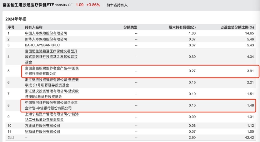 在富国恒生港股通医疗健康ETF中,富国福强的养老金产品略有增加,而中国银河企业的年金计划略有减少。值得注意的是,中国人寿在2024年第四季度大幅加持了1亿只基金,成为第一大持有人。
