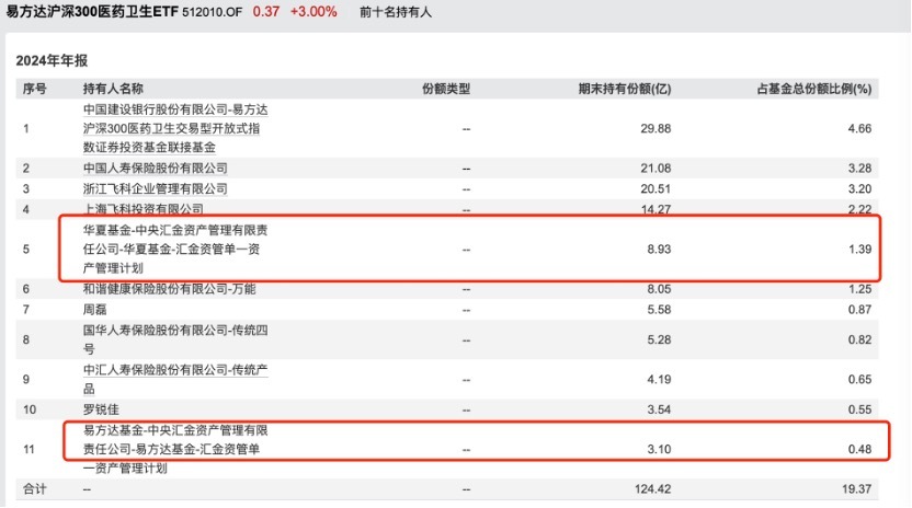 2024年底,易方达沪深300医疗服务ETF和永胜CSI全指医疗器械ETF前十大持有者出现了两个单一的国家队资产管理计划。