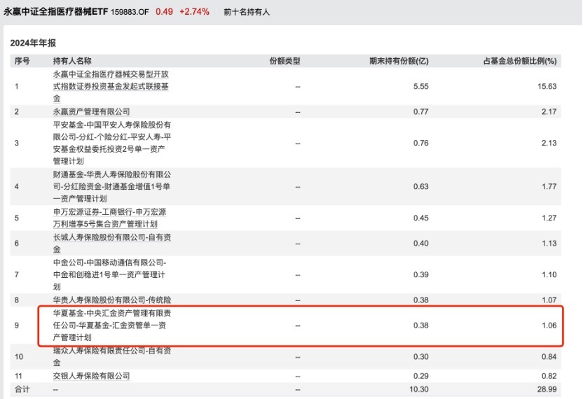 另外一位受到国家队加持的是永胜CSI全指医疗器械ETF,2024年第四季度,汇金通过“华夏基金-汇金资产管理单一资产管理计划”新晋该基金前十大持有人,年报披露,新晋3772.02万份,市值1829.05万元。