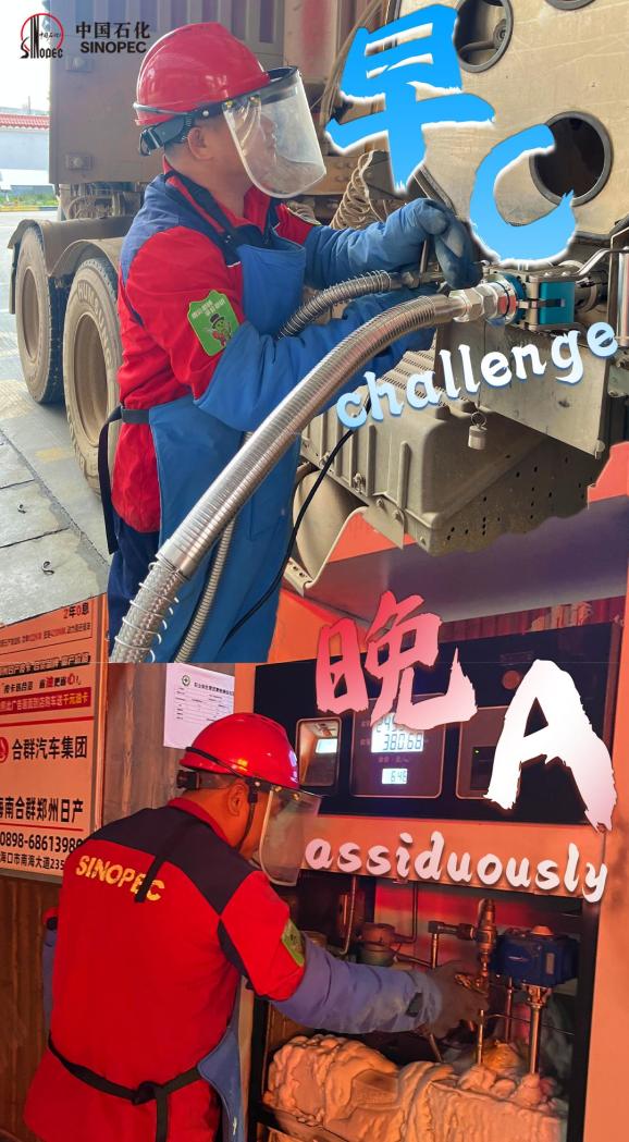 夜晚已经很深了,丁德华仍然精力充沛地完成。(accomplish)发油工作。虽然天气寒冷,但他的目光如火如荼,认真做好每一辆卡车的发油工作,为城市能源需求保驾护航。