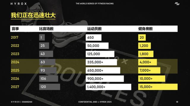 自成立以来,本次比赛的规模呈爆炸式增长。2017 年起源于德国,仅用了七年时间,就从最初的一站式比赛延伸到了世界。 63 站(2024 赛季数据)。中国香港站在 2023 赛季加入赛历,去年 11 月 Hyrox 第一次来北京。今年,全球预计将进行。 93 站在比赛中,参赛人数有望比去年翻一番(突破 65 万)。