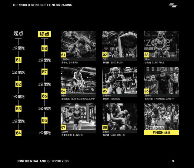 如果将 Hyrox 解释一下比赛规则,很容易理解什么是“跑步”。 “健身”。每个参与者都需要完成。 1 一次健身动作在公里速跑后交替进行,共需完成8组(相当于 8 公里跑加八个健身动作)。这八个健身动作分别是滑雪机、推雪橇、拉雪撬、波比跳远、划船机、农民行走、重量箭步蹲、投药球。