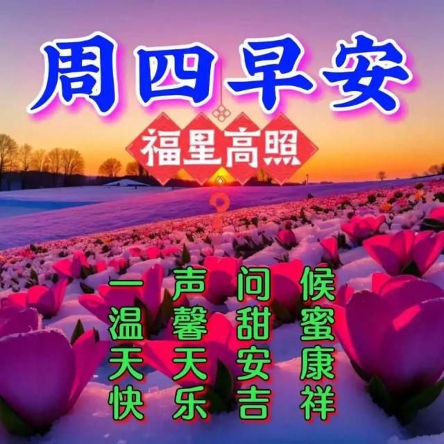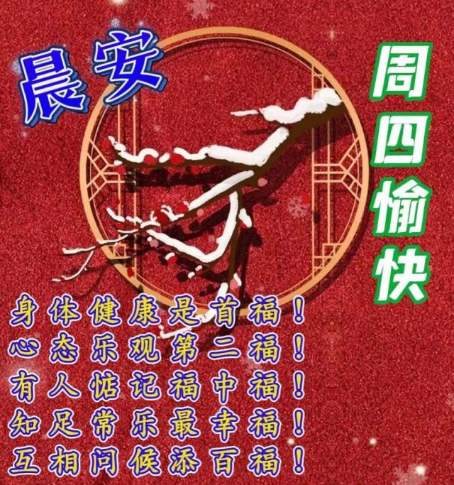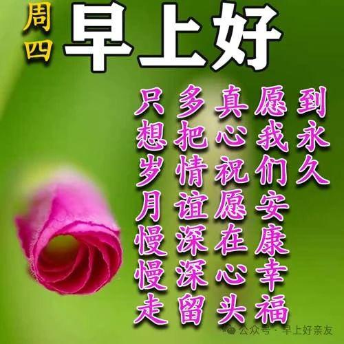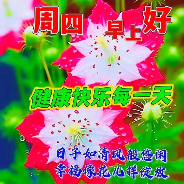 人的一生,健康是金,幸福是药,慷慨是幸福,善良是福,珍惜是宝,幸福永远是最好的,幸福的每一天。给你一缕微风,让你在早晨的温暖中醒来;给你一片光明,晨光带给你快乐的心情;真诚地问候你,希望你一整天都放松;周四早上祝你幸福!