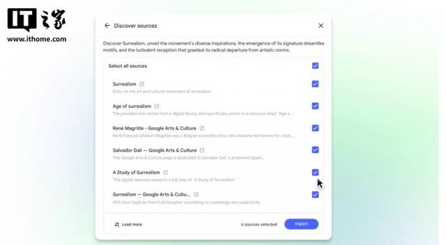 按下这个按钮,就会出现一个“你感兴趣的是什么?”"提示输入框。使用者只需在文本框中描述他们想要找到的内容,越具体越好,然后点击提交按钮。NotebookLM 在几秒钟内搜索数百个隐藏的网络资源,对它们进行分析,并根据用户的话题选择最相关的信息。最终,它会整理出一个最多包括的部分 10 一份推荐材料目录,并附上一份解释其相关性的摘要。使用者可查看要导入笔记本的信息,然后点击导入按钮。