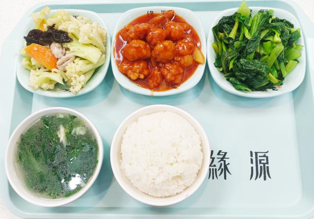 两种肉类(四选二,如糖醋排条、油炸虾、粉蒸肉、红烧狮子头)、每天提供两种素菜 2 各种各样的时蔬)