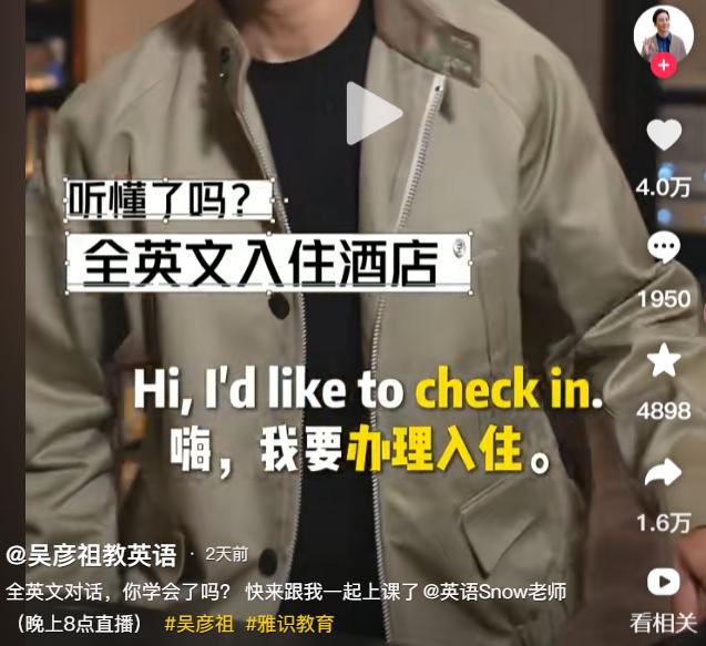 其中 @吴彦祖教英语 抖音帐号,主要是在情景中学习英语,比如彦祖如何到咖啡店点咖啡,如何到酒店办理入住手续。