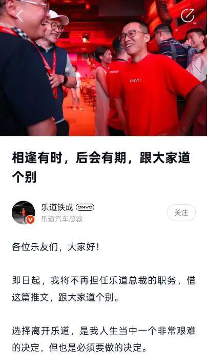 4 月 2 日,艾铁成在 APP 上面宣布辞去乐道汽车总裁一职。在声明中,他表示这是一个“非常困难的决定”,但没有透露具体原因。