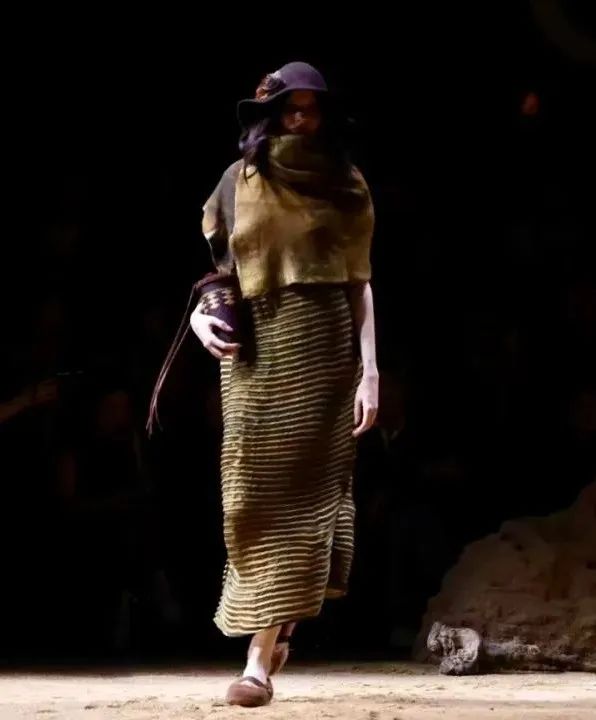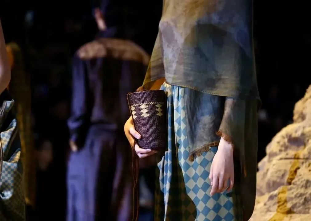 据悉,徐行草编辑在上海时装周上的展示,源于与嘉定当地服装品牌“荷木HEMU”的合作。荷木HEMU是一个以中国元素为主要文化载体的原创设计师品牌。本次上海时装展以“楼兰”为主题,通过400多件新中式服装,以非遗工艺构建了贯穿古今的潮流叙事。当灯光亮起时,模特们背着草包慢慢地走了出来,粗糙的黄草纤维和优雅的衣服相互辉映,将观众带入沙漠中孤独的烟雾意境。