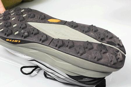 除了缓冲层,乐途越野跑鞋的底层还嵌入了加厚的上翻橡胶层。——原树脂橡胶耐磨防滑鞋底。