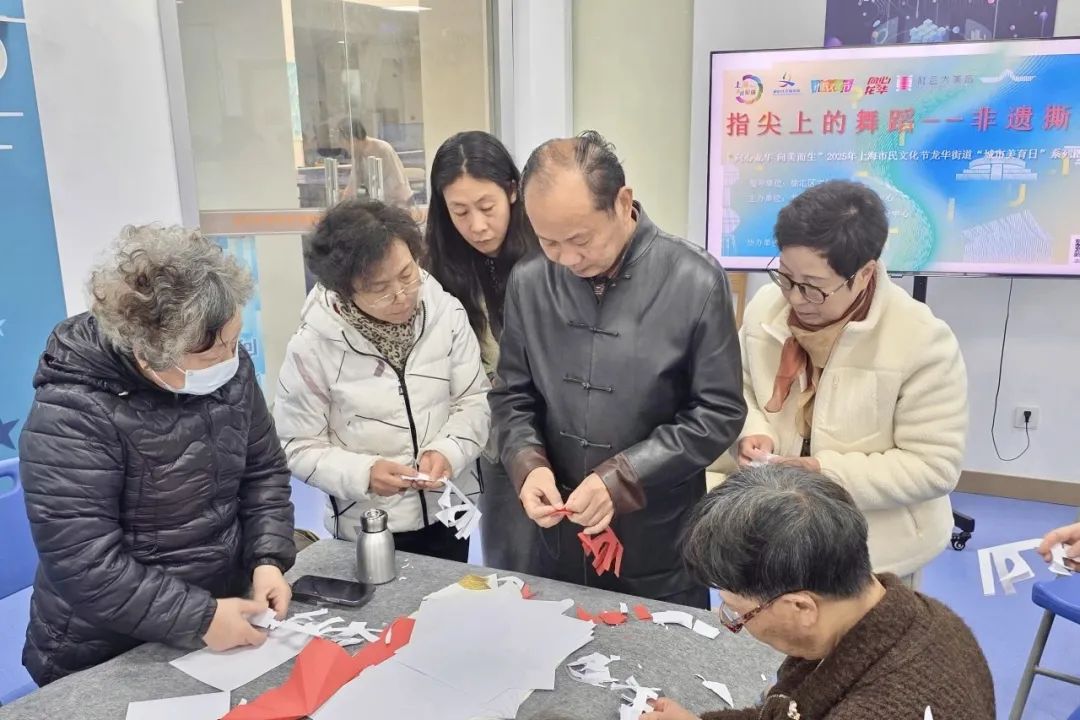 在活动中,非遗技艺大放异彩。在龙华街道社区党群服务中心,以“指尖舞蹈”为主题的中国撕纸书法创始人蒋劲华,带领居民体验非物质文化遗产撕纸创作。参与者手持素纸,在撕、折、叠的巧劲中,一幅幅灵动的书法跃然眼前,传统技艺的匠心与创新在此交织。街道还推出了当地非物质文化遗产项目“龙华民谣花棒操”和“荡湖船”的感觉。居民们跟随节奏跳舞,近距离感受民俗文化的活力。