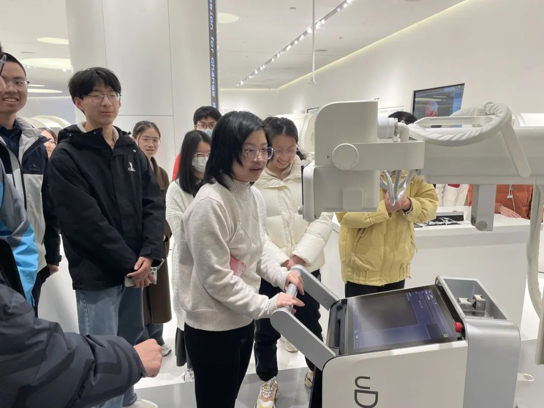 走进生产线和党建展厅,各种先进的设备让24级预防医学专业的何吉星大开眼界。除了科技创新,医学人文关怀也让24级临床医学八年制专业的王路宁记忆深刻:“幽闭恐惧症患者在检查磁共振成像时可能会感到不舒服,R&D人员在机器内部设计蓝色星空图案,为患者创造更舒适的检查环境。”
