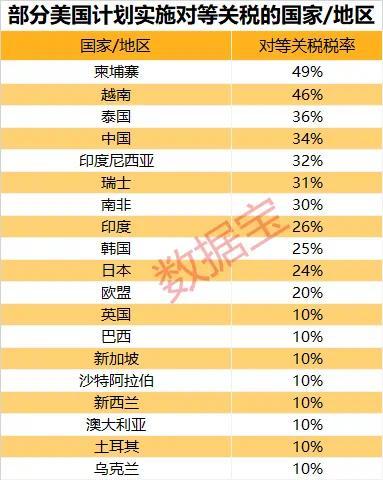 根据特朗普展示的图表,美国将对柬埔寨征收49%的“相等关税”,对中国征收34%的“相等关税”,对欧盟征收20%的“相等关税”,对巴西和英国征收10%的“相等关税”,对瑞士征收31%的“相等关税”,对印度征收26%的“相等关税”,对韩国征收25%的“相等关税”,对日本征收24%的“相等关税”。对印尼实行32%的“平等关税”,对泰国实行36%的“平等关税”。