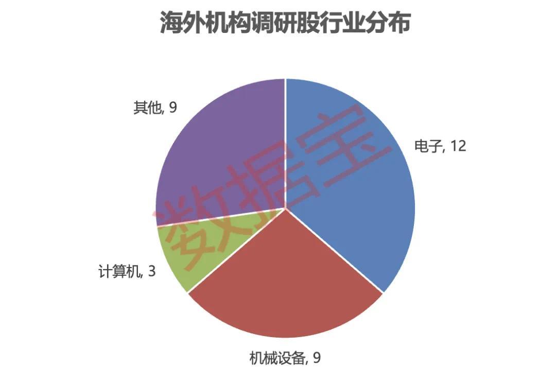 就行业而言,海外机构调研股主要集中在各大科技板块,海外机构调研的33只股票中,电子产业个股数量最多。,共有12只;机械设备和计算机行业紧随其后,分别有9只和3只;上述三个行业的股票总数占总数的70%以上。