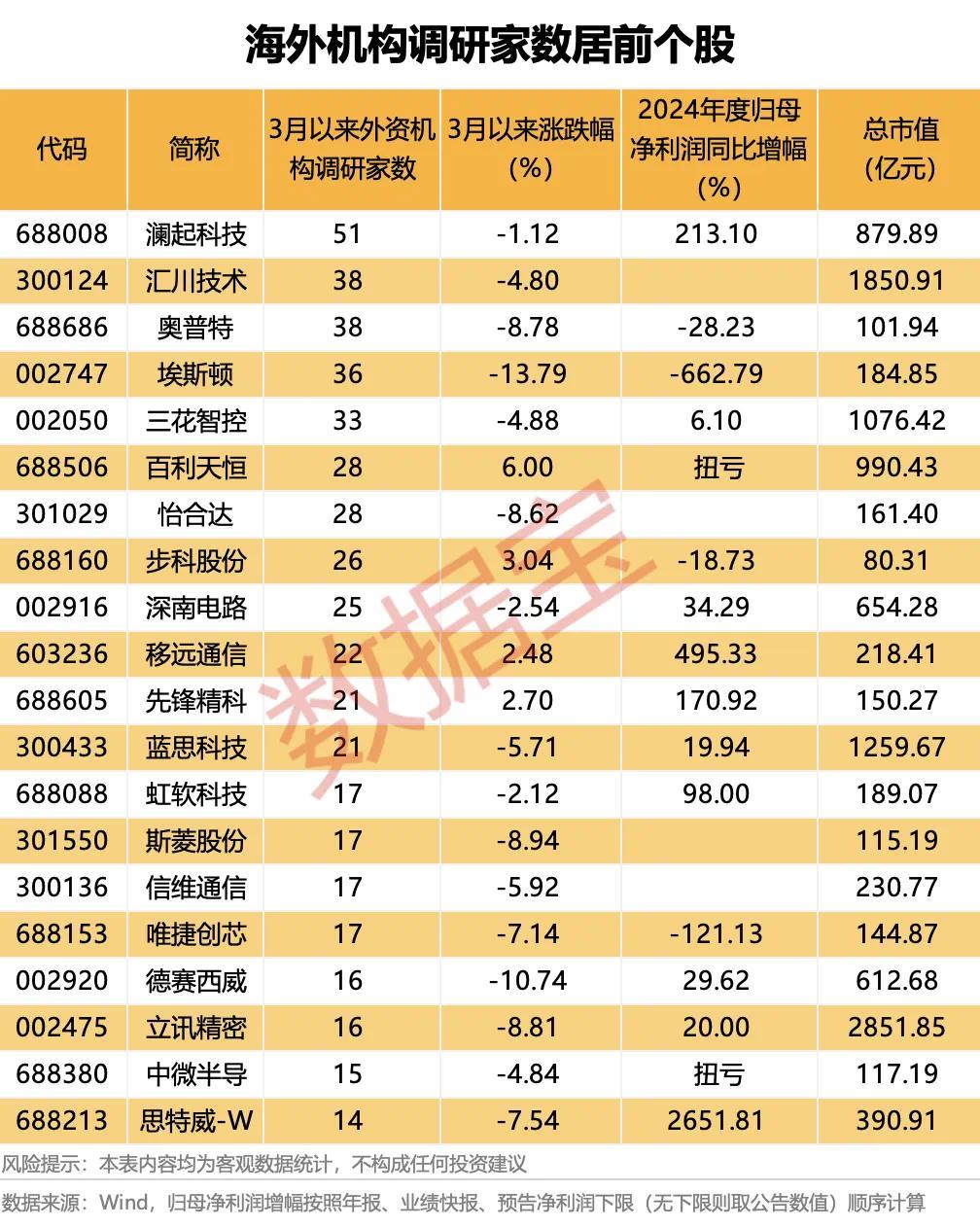 a股上市公司也受到海外机构的密集调查。据《证券时报》统计,自3月份以来,海外机构关注的上市公司有210家,其中33家获得了10多家海外机构的调查。澜起科技、汇川科技、奥普特、埃斯顿、三花智能控制第一,海外机构调查数量超过30家。