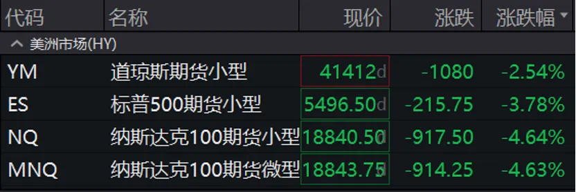 当特朗普宣布“相等关税”时,美股已经收盘,美股股指期货集体暴跌。截至发稿时,标准普尔500指数期货下跌超过3.5%,纳斯达克100指数期货下跌超过4.5%,道指期货下跌超过2.5%。