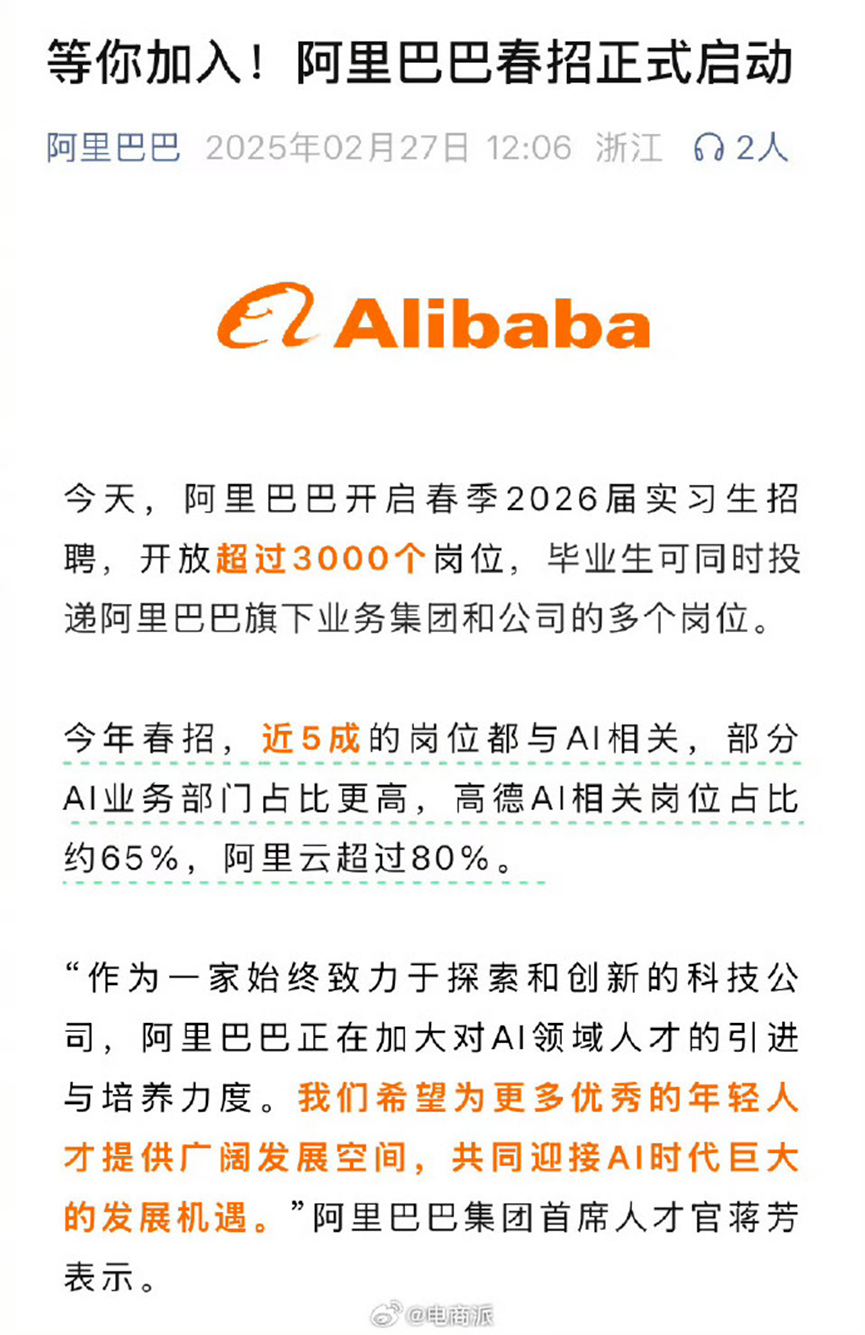 值得一提的是,阿里巴巴主席蔡崇信在3月25日的汇丰全球投资峰会上突然宣布重启招聘,扩大人才储备。前段时间,阿里开始了2026年春季实习生招聘。如果你仔细观察,你会发现AI相关的工作占了将近一半。