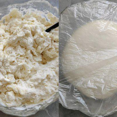 2、揉面做饺子皮:在 500 加入克面粉 2 克盐搅拌均匀,加入少量多餐。 250 克清水(冷水),用筷子搅拌成面絮,揉成光滑的面团,盖上保鲜膜静置半小时,取出再揉,继续盖上保鲜袋静置半小时,备用时取出揉捏。