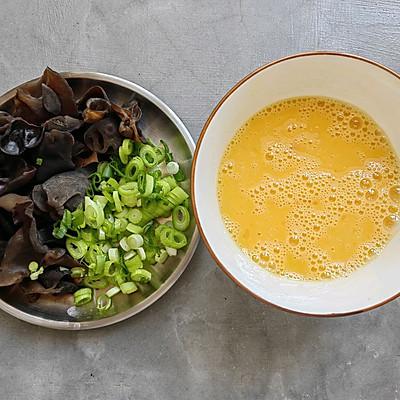 3、木耳早泡,焯水;鸡蛋打散成蛋液,葱切细碎备用。