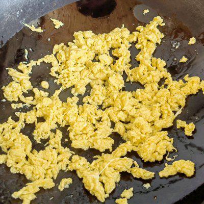 6、将打散的蛋液迅速分散炒出蛋碎,然后盛出备用,锅底留油。