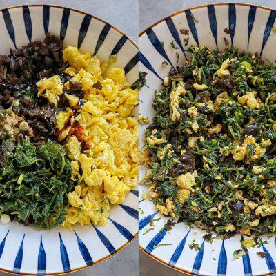 7、将焯过的木耳剁碎,炒好的鸡蛋碎,葱花碎一起加入处理好的茵陈(白蒿)中, 2 十三香粉,2 勺子耗油,适量盐和味精,加入锅中炒鸡蛋后的底油。搅拌均匀成茵陈(白蒿)素馅。