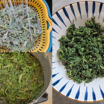 4、茵陈(白蒿)采摘干净,放入沸水中焯一分钟,沥干水分,挤出水分,剁碎备用。
