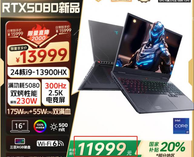 即便是国际品牌型号,价格相对较低,国补 2000 人民币之后,到手价格也要 16999 元-仍与普通用户几乎绝缘。而且雷神这个新机器, RTX 5080 版本的猎刃 16 2025年,如图所示,首发价格为 13999 元,并支持 2000 块的国补优惠,补贴到手价格是 11999 元!关注笔记本的朋友都知道,这个价格是目前市场上价格最低的。 RTX 5080 比起一些国际品牌,游戏本 5080 型号便宜 5000 人民币以上,差价还是很大的,也让万元预算出头的小伙伴们,也有了 RTX 5080 这个游戏本可以选择,或者说,直接拉低大家的开始。 RTX 5080 游戏本的门槛!接下来我们就来看看它的情况。