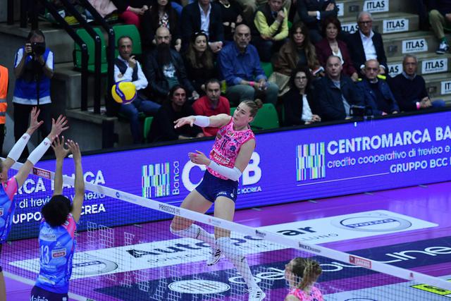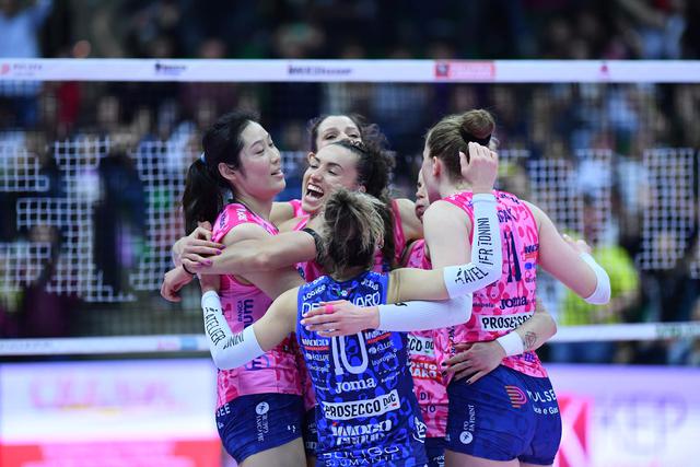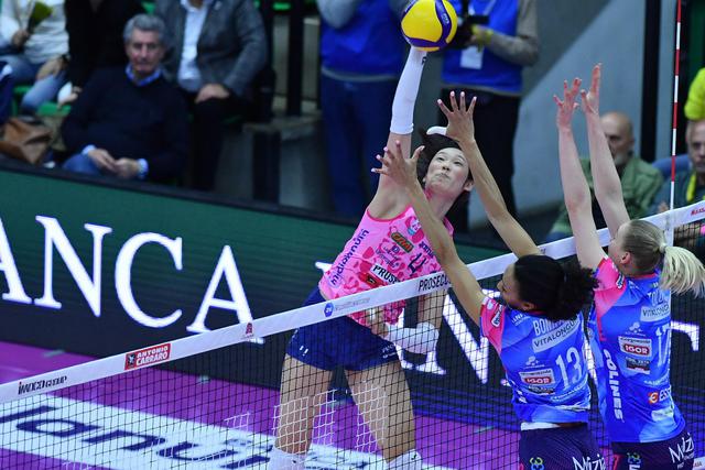 朱婷,意甲女排,科内3-1逆袭诺瓦拉拉。 场地2-1领先,接近总决赛。