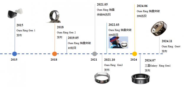 2015 年,Oura 首款智能戒指发布,主推,主推。 NFC 功能。此后,Oura 更加关注智能戒指所能带来的数据监控能力,并不断完善其技术,相继推出更新版本。2018 2000年,公司推出第二代产品,提供睡眠分析、心率监测等健康和健身跟踪功能,以及自主研发。 APP 连接,提供数据分析功能,引起市场关注。那时候,在智能手表市场上,运动功能手表继续火爆,Apple Watch 第四代产品开始配置心电监测功能,健康场景成为扩展方向。