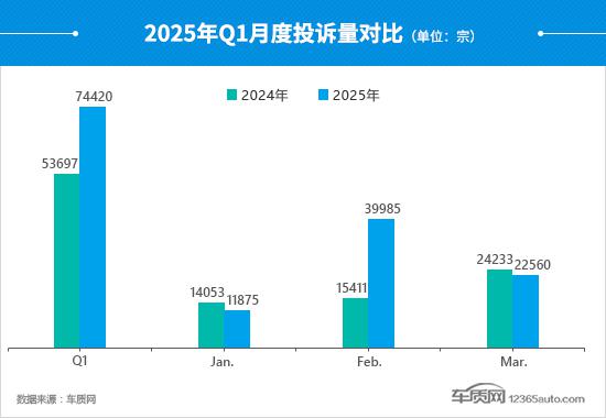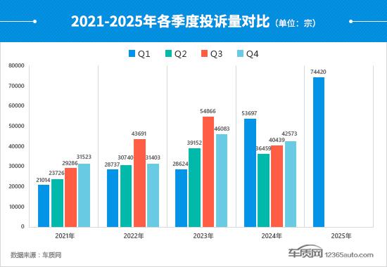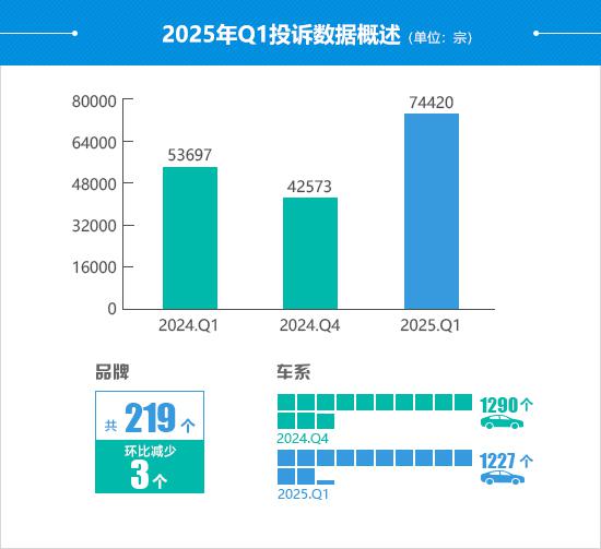 2025 2008年第一季度,汽车质量网共同接受消费者对汽车产品的有效投诉 74,420 宗(包括第三方平台和后装轮胎投诉) 45 宗),环比增长 同比增长74.8% 38.6%。根据汽车质量网络数据分析,本季度共受理 219 一个汽车品牌和 1,227 与上季度相比,一款车型的投诉减少了。 3 个品牌和 63 个车型。