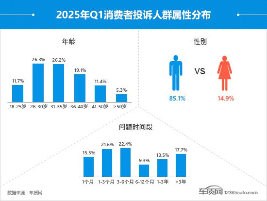就性别比例而言,男性客户比例持续下降,同时也反映出女性消费者的维权意识和主动性不断提高。根据投诉群体的年龄组,26-35 年龄仍然是主要投诉群体,占比超过一半,但与上季度相比略有下降。此外,18-25 年龄较大的年轻消费者比例有所提高。值得注意的是,这个季度买车 6 投诉在个月内出现问题的比例急剧上升, 2024 第四季度有所改善 29 %,接近总数的 6 成功,新车阶段出现问题的可能性越来越大。