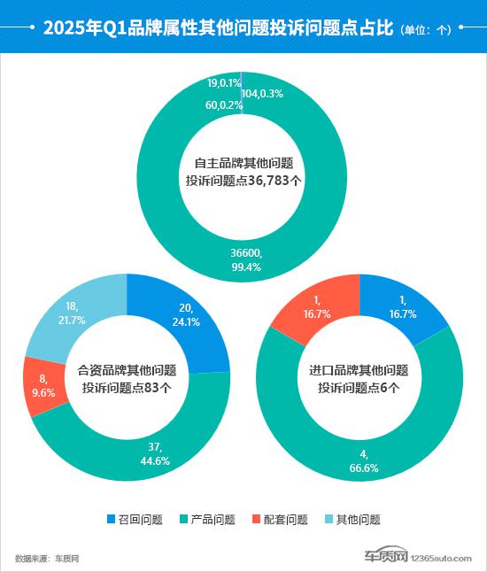 从其他问题投诉点的比例不难看出,产品问题在三个品牌属性中占有核心地位,尤其是自有品牌。此外,召回问题在合资品牌中也占有一定比例,投诉点较上月有所上升。 185.7%的比例增加了约185.7%。 20.4 %,接近总数的 1/4。