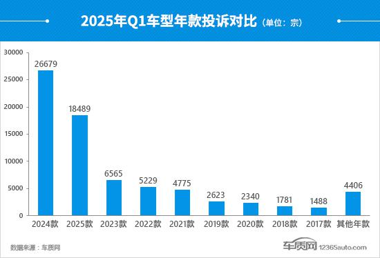 该季度 2024 款和 2025 汽车爆发,投诉数量环比翻倍,远远领先于其他年份的汽车。其中,2024 汽车创造了季度投诉数量的新纪录,投诉问题集中在“新旧迭代纠纷”上。相对而言,2023年 车辆投诉量较上月略有增加,超过一半的投诉均为质量问题,主要表现为“影音系统故障”和“变速箱顿挫”。