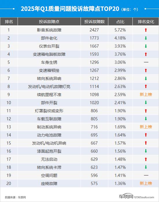 在这个季度排名之前 20 根据名称投诉故障点,“视听系统故障”卷土重来,排名第一。投诉故障数量与上季度基本持平,但占比略有增加。“变速箱电脑板故障”在上个季度持续增长,投诉故障数量逐月增加。 排名跃升至第四位的25.3%。值得注意的是,“续航里程不准”投诉故障数量作为本季度上市的新故障点,与部分独立新能源车型有关。