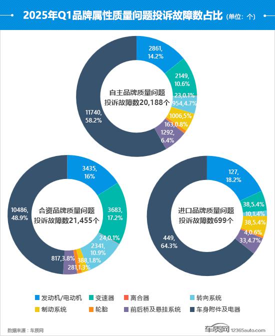 第一季度,自主品牌投诉故障数量再次刷新同期历史最高纪录,环比增长 12.4%。其中,变速箱、转向系统和制动系统的投诉故障数量较上月大幅增加,各自上升 41.9%、20.3% 和 69.1%。相比之下,合资、进口品牌的投诉故障数量不断下降,占比最高的投诉故障点仍然是车身附件和电器。从比例来看,车身配件和电器仍然是三大品牌属性的投诉主体,但份额略有变化,在合资品牌中的比例不足。 5 成。