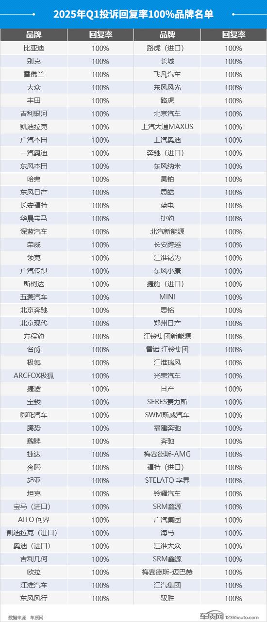 第一季度投诉回复率达到 100% 的品牌共有 86 与上季度相比,家庭减少了。 5 家,这些品牌对客户需求的积极态度和重视程度值得肯定。然而,一些品牌的投诉回复率不足。 5 成功,如理想汽车、零跑汽车等,亟待提升。