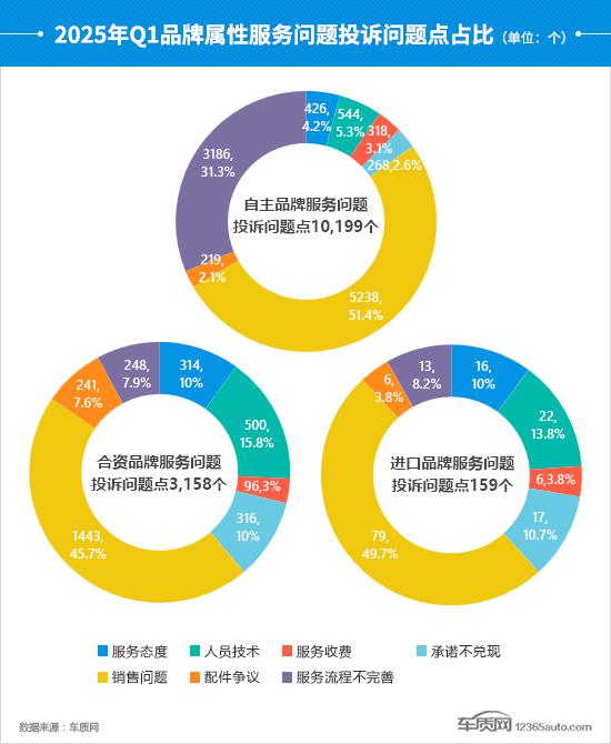 第一季度,自主品牌的投诉数量和比例都打破了历史记录,投诉数量同比增长超过 1.9 倍数,比例提高 30.2 %。投诉主体从质量问题转变为其他问题,投诉问题集中在“新旧迭代纠纷”上。同期,合资和进口品牌的投诉数量和比例明显下降,短期口碑表现有所提升。