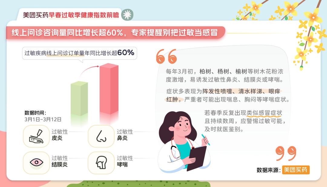 「大众不再把过敏当作忍一忍过去的小病小痛,整体重视程度不断提高。上述平台相关负责人表示,除了紧急购药需求外,还有很多客户很早就在美团直营大药店下单备药,提前服药预防。此外,中医理疗也受到过敏人士的高度赞扬。3月以来,中医咨询用户过敏增长近40%,针灸、艾火、中医茶成为90后、90后年轻人抗过敏的新选择。