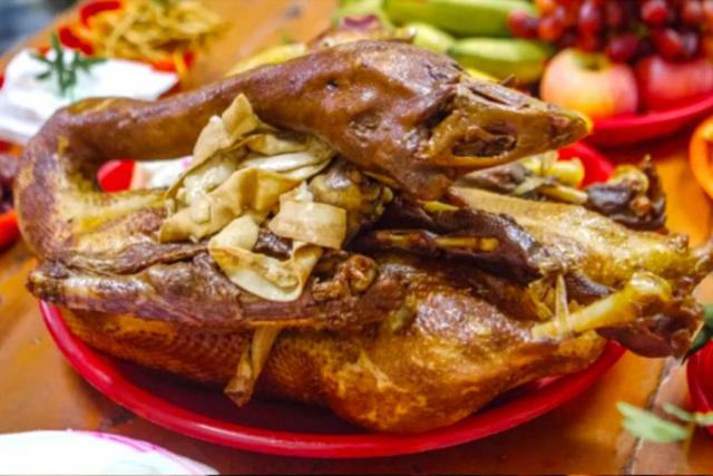 再等一小时,等待一只鹅的皮完全变成红棕色,此时可将鹅取出,摊凉,切片,上菜。