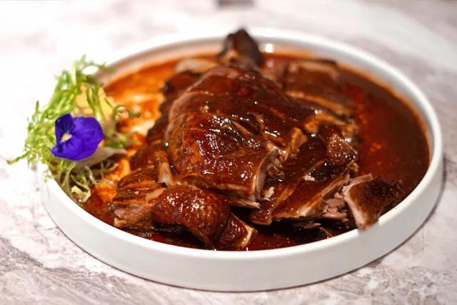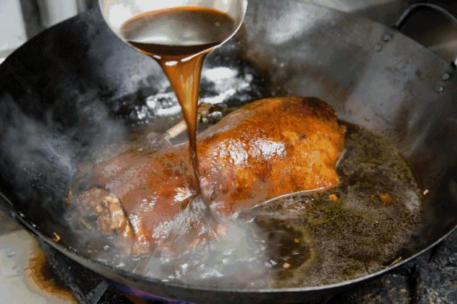 红烧鹅的制作要从吊汤开始,煮猪骨头,炒香料,这样香味分子才能很快被唤起。首先,将卤水和香料放入锅中,以平衡浓郁的香味;然后倒入一只完整的鹅。炖的时候要把鹅翻过来,直到鹅的皮变成迷人的焦糖色,卤汁完全锁在鹅肉里。