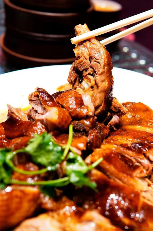 湛江的白切鹅从来没有像绿头一样简单地用清水煮鹅肉,而是将拔毛后的光鹅浸泡在药材的汤里,慢慢煮。 2400 秒,再取出斩件。时间是实现美味的魔力,多一刻则老,少一刻则坚韧。