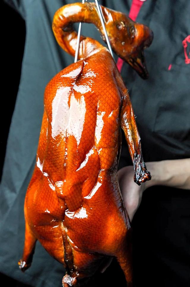 经过处理的鹅被吊入炉中烧制,跳动的红色火焰舔舔鹅的身体,直到它像琥珀铂一样的红棕色被一点点染色。玻璃油溢出蛋白质的焦香味,与淡淡的木质香味相互拥抱,像恋人一样痴迷。
