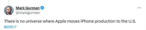 快科技 4 月 7 日消息,苹果记者 Mark Gurman 根据社交平台的说法,苹果永远不会 iPhone 生产转移到美国本地。